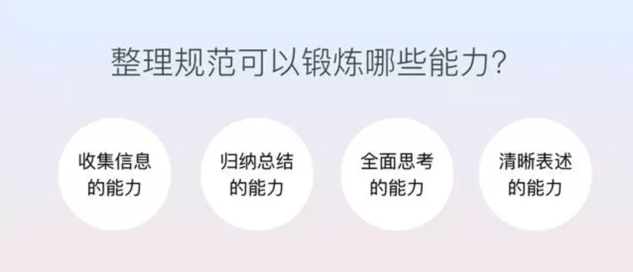 在整理规范时,收集场景、收集定义、收集优秀案例都可以锻炼到我们的收集信息能力,这个基本能力在日常工作中也经常需要用到,例如做需求前需要先收集需求背景相关信息,了解清楚是什么、为什么、怎么做的问题。